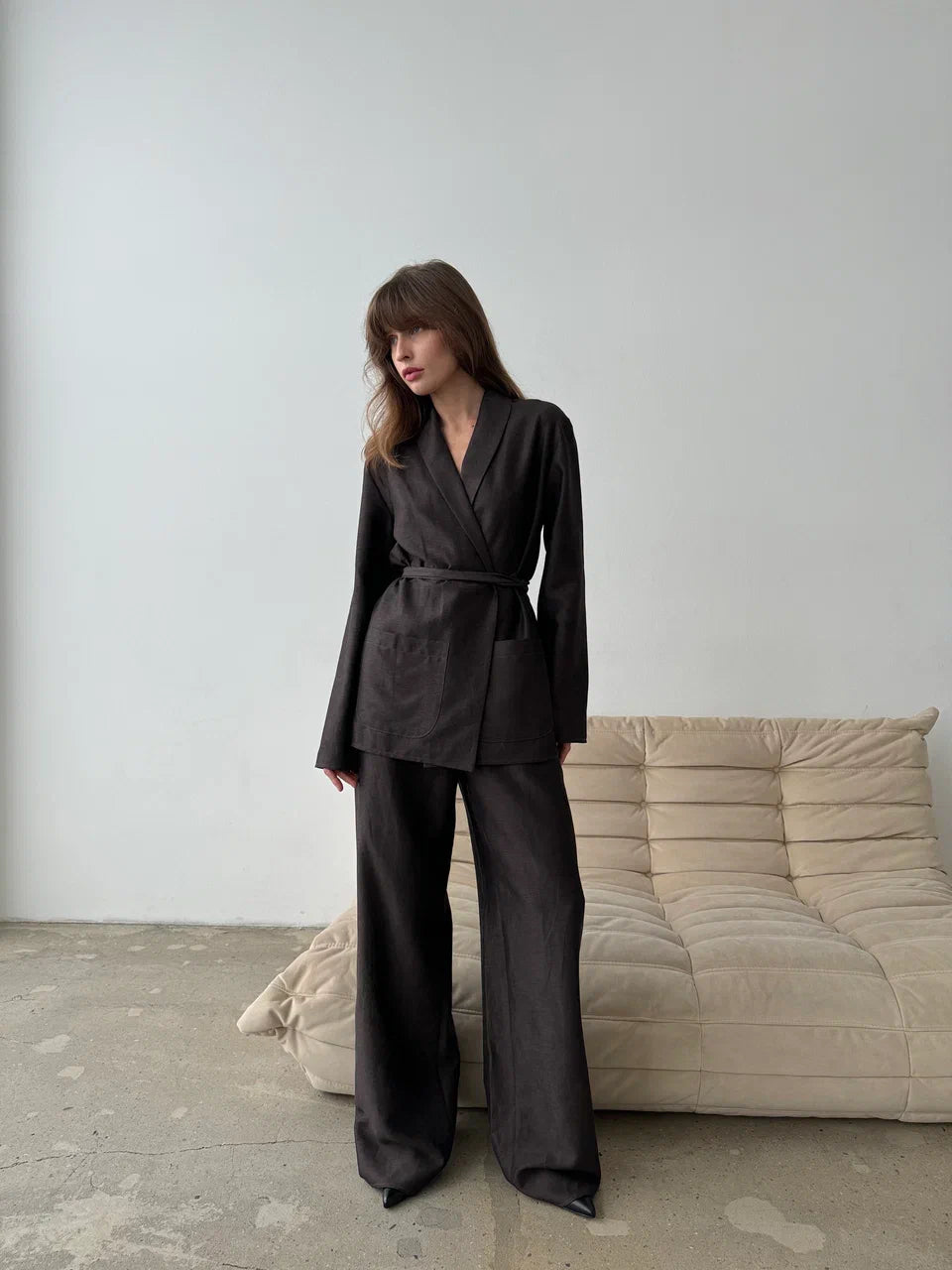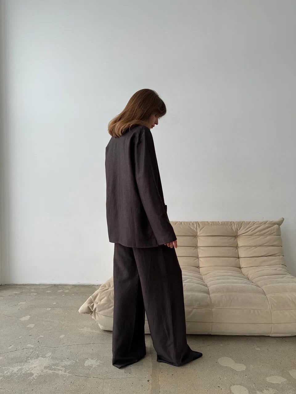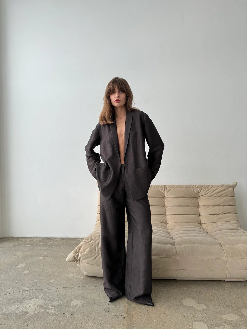 Stay ahead of the style curve with the Modern Maven Suit. Made from sustainable viscose, this suit combines luxurious softness with eco-friendly charm. The blazer features sharp tailoring and minimalist detailing for a sophisticated edge, while the trousers offer a slightly tapered fit, creating a balanced and versatile silhouette. This set is perfect for making a bold yet refined statement, whether styled with a crisp shirt or a delicate camisole.